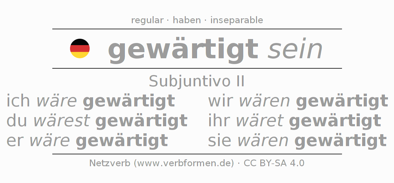 El verbo gewärtigen, conjugado completamente en todas las personas y números gramaticales en Subjuntivo Pretérito.