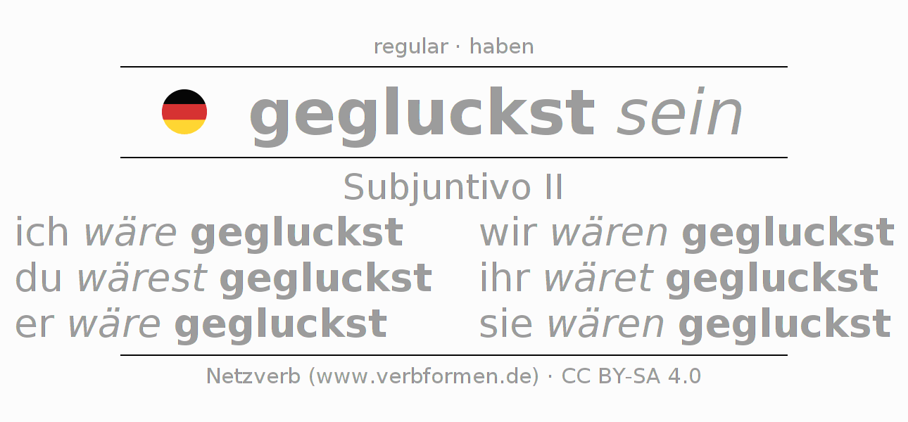 La conjugación de glucksen en Subjuntivo Pretérito Subjuntivo Pasivo situativo es ich wäre gegluckst, du wärest gegluckst, er wäre gegluckst, wir wären gegluckst, ihr wäret gegluckst, sie wären gegluckst.Para construir esta formas se requiere seguir algunas reglas gramaticales y también las especificaciones para la conjugación de verbos simples de glucksen en Subjuntivo II . Comentarios ☆