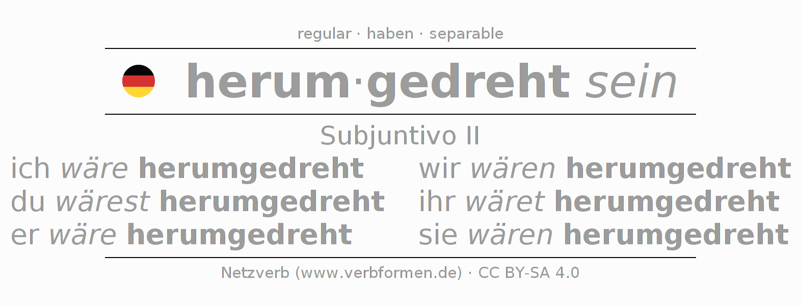 El verbo herumdrehen, conjugado completamente en todas las personas y números gramaticales en Subjuntivo Pretérito.