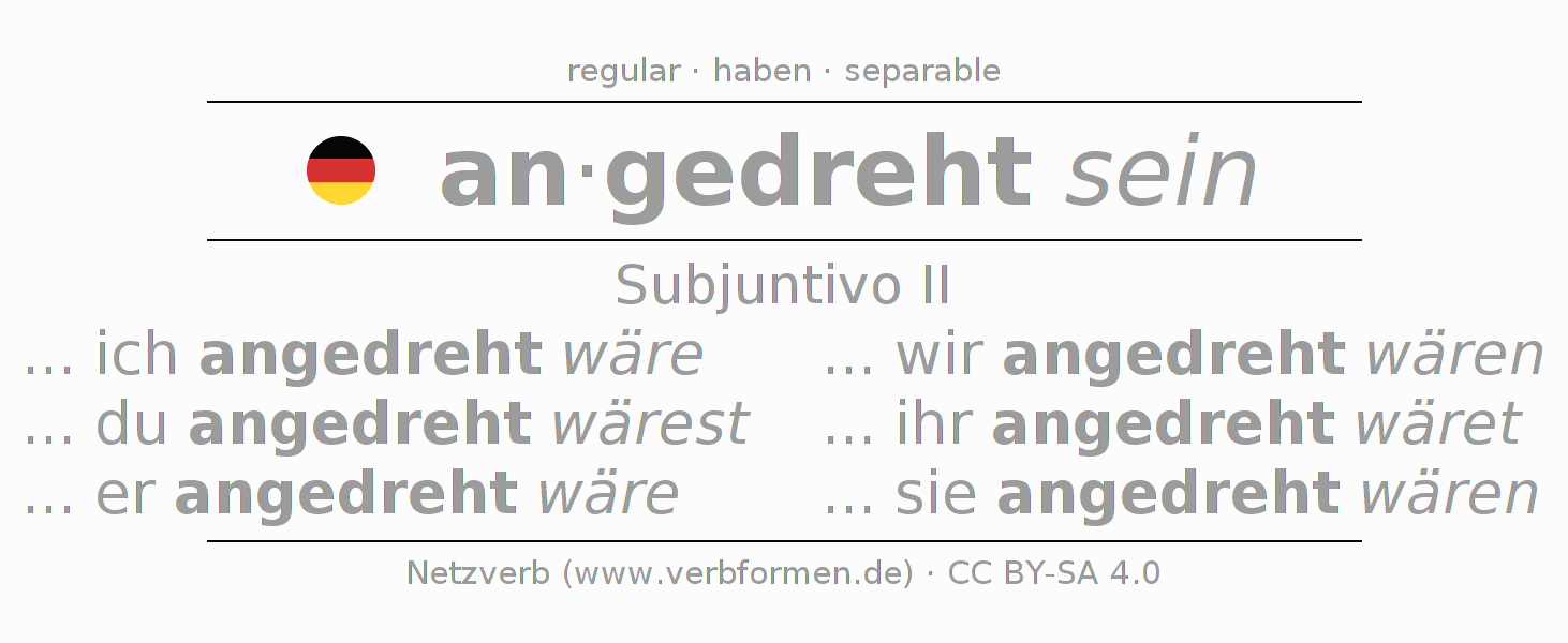 La conjugación de andrehen en Subjuntivo Pretérito Subjuntivo Pasivo situativo es ... ich angedreht wäre, ... du angedreht wärest, ... er angedreht wäre, ... wir angedreht wären, ... ihr angedreht wäret, ... sie angedreht wären.Para construir esta formas se requiere seguir algunas reglas gramaticales y también las especificaciones para la conjugación de verbos simples de andrehen en Subjuntivo II . Comentarios ☆