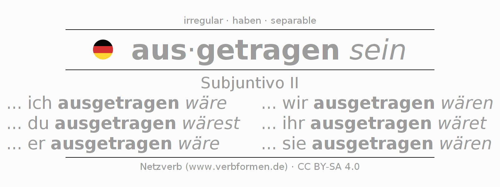 La conjugación de austragen en Subjuntivo Pretérito Subjuntivo Pasivo situativo es ... ich ausgetragen wäre, ... du ausgetragen wärest, ... er ausgetragen wäre, ... wir ausgetragen wären, ... ihr ausgetragen wäret, ... sie ausgetragen wären.Para construir esta formas se requiere seguir algunas reglas gramaticales y también las especificaciones para la conjugación de verbos simples de austragen en Subjuntivo II . Comentarios ☆