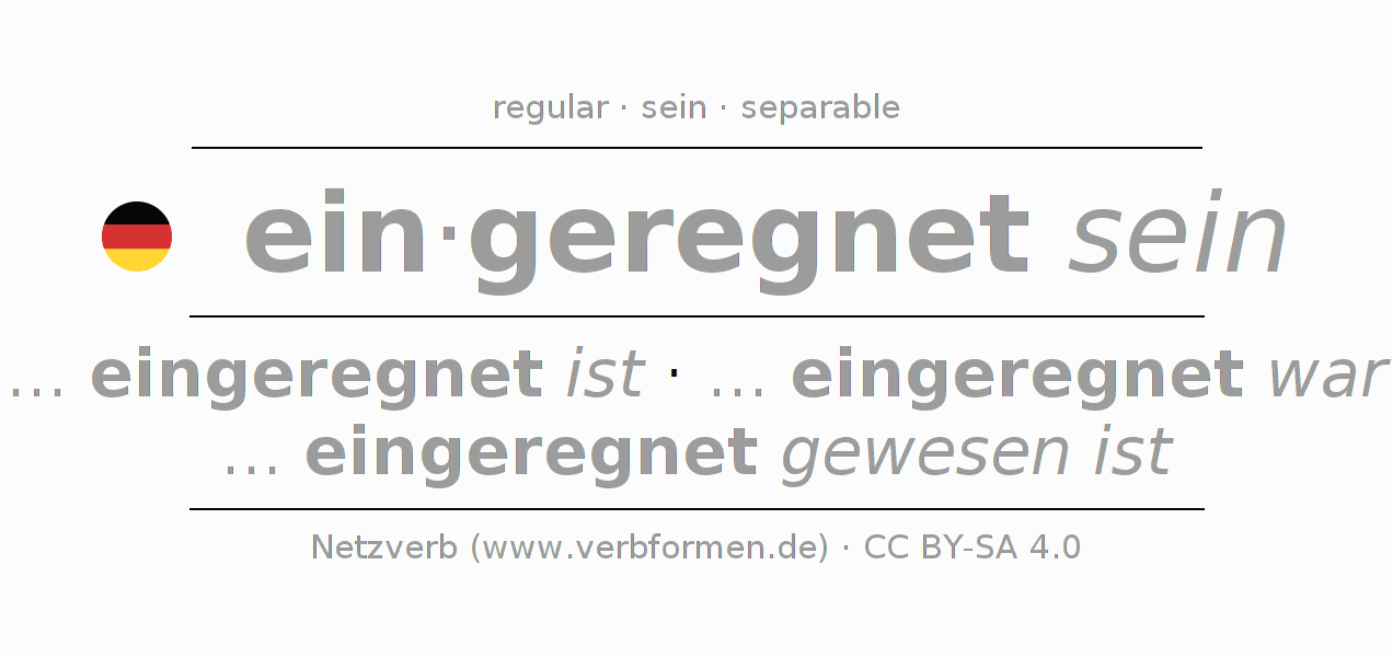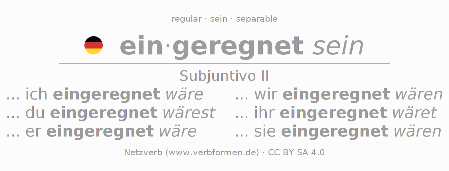 El verbo einregnen (ist), conjugado completamente en todas las personas y números gramaticales en Subjuntivo Pretérito.