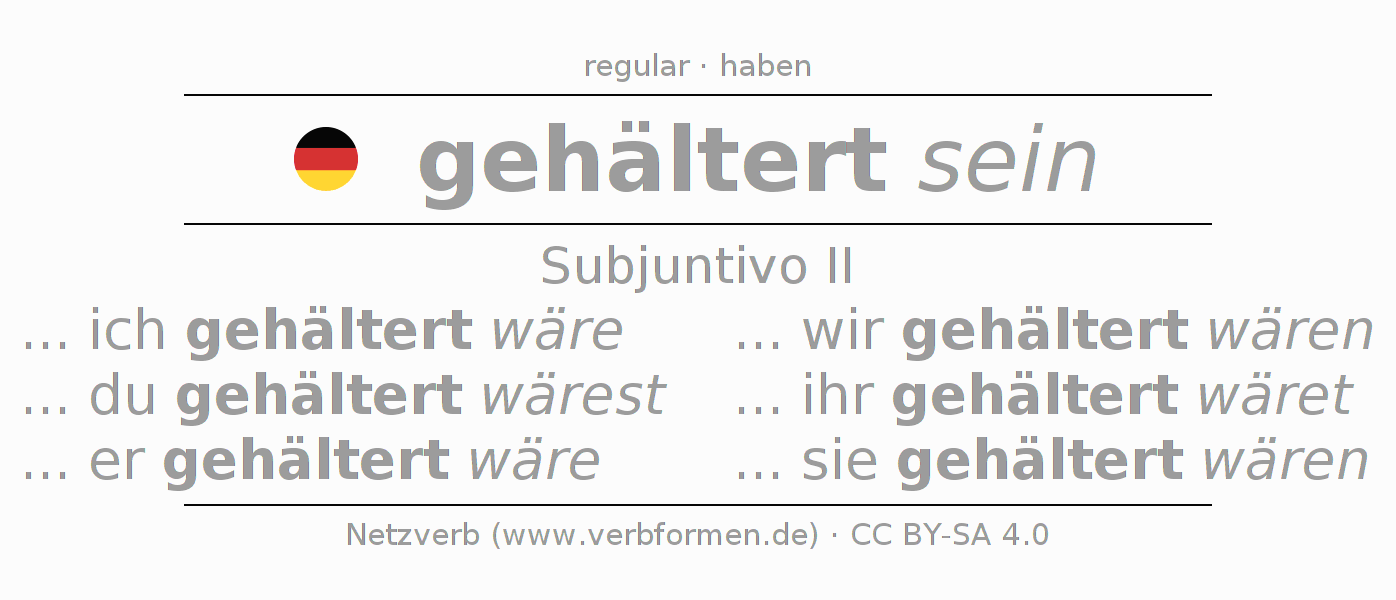 La conjugación de hältern en Subjuntivo Pretérito Subjuntivo Pasivo situativo es ... ich gehältert wäre, ... du gehältert wärest, ... er gehältert wäre, ... wir gehältert wären, ... ihr gehältert wäret, ... sie gehältert wären.Para construir esta formas se requiere seguir algunas reglas gramaticales y también las especificaciones para la conjugación de verbos simples de hältern en Subjuntivo II . Comentarios ☆