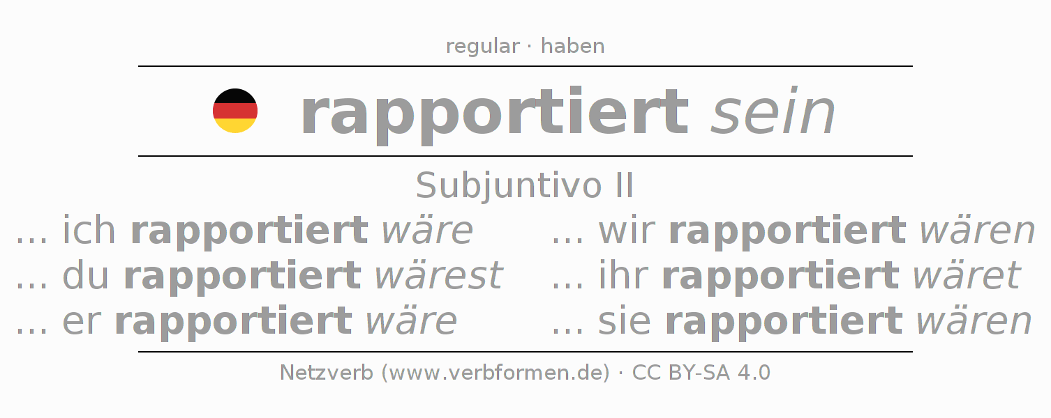El verbo rapportieren, conjugado completamente en todas las personas y números gramaticales en Subjuntivo Pretérito.