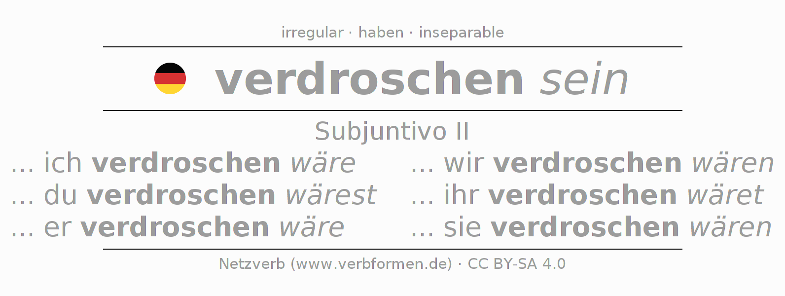 El verbo verdreschen, conjugado completamente en todas las personas y números gramaticales en Subjuntivo Pretérito.