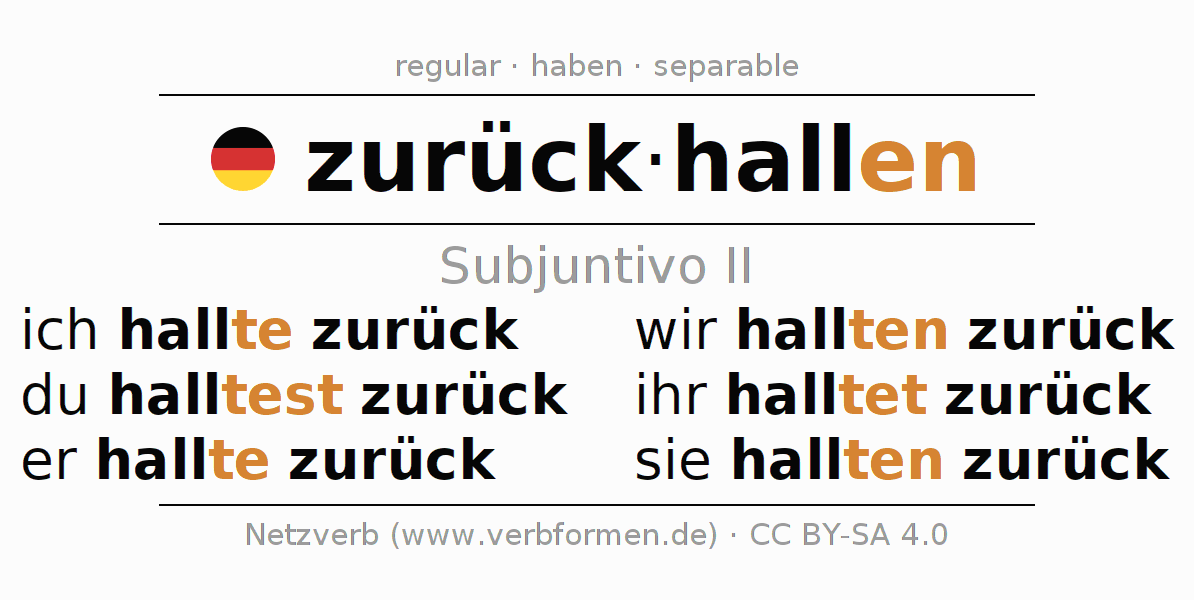Este verbo zurückhallen (hacer eco, resonar) se conjuga en subjuntivo II de la siguiente manera: ich hallte zurück, du halltest zurück, er hallte zurück, wir hallten zurück, ihr halltet zurück, sie hallten zurück
