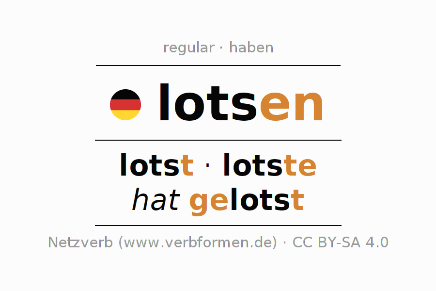 Tablas de verbos para la conjugación de lotsen en línea, representadas de forma simple, con todas las construcciones verbales en singular y plural, en todas las personas gramaticales (1ª persona, 2ª persona, 3ª persona). El practicar la conjugación del verbo lotsen es útil para tareas, exámenes, la escuela, la universidad, las clases de alemán y para los estudiantes adultos. Especialmente para los estudiantes del alemán es muy importante el conjugar los verbos y el formar las raíces verbales de forma correcta. Aquí encuentras más información acerca del tema Wiktionary lotsen und unter lotsen im Duden.