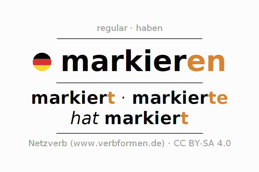 Tablas de verbos para la conjugación de markieren en línea, representadas de forma simple, con todas las construcciones verbales en singular y plural, en todas las personas gramaticales (1ª persona, 2ª persona, 3ª persona). El practicar la conjugación del verbo markieren es útil para tareas, exámenes, la escuela, la universidad, las clases de alemán y para los estudiantes adultos. Especialmente para los estudiantes del alemán es muy importante el conjugar los verbos y el formar las raíces verbales de forma correcta. Aquí encuentras más información acerca del tema Wiktionary markieren und unter markieren im Duden.