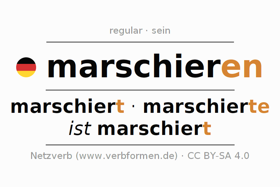 Tablas de verbos para la conjugación de marschieren en línea, representadas de forma simple, con todas las construcciones verbales en singular y plural, en todas las personas gramaticales (1ª persona, 2ª persona, 3ª persona). El practicar la conjugación del verbo marschieren es útil para tareas, exámenes, la escuela, la universidad, las clases de alemán y para los estudiantes adultos. Especialmente para los estudiantes del alemán es muy importante el conjugar los verbos y el formar las raíces verbales de forma correcta. Aquí encuentras más información acerca del tema Wiktionary marschieren und unter marschieren im Duden.