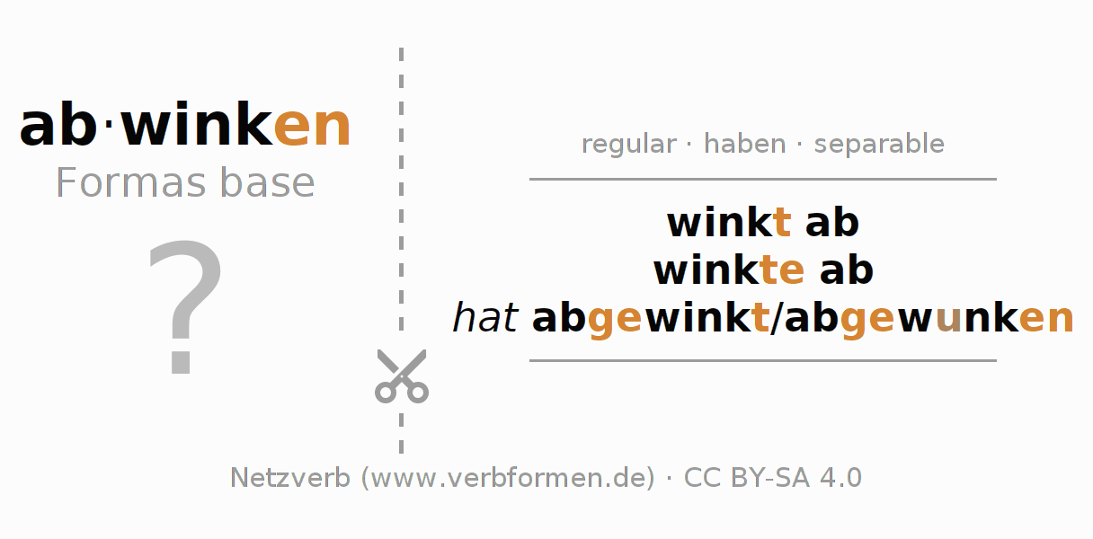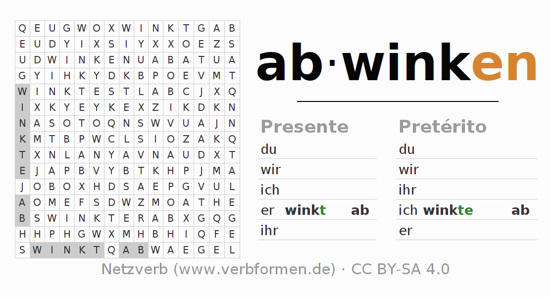 Las hojas de trabajo te ayudan para practicar con la conjugación de los verbos abwinken en la escuela o de forma autodidacta. El material de estudio es Open Educational Resources (OER), es decir, libre de licencias CC BY-SA 4.0 y pude ser descargado y utilizado de forma gratuita, por ejemplo para la escuela. Con este fin tenemos para ti varios tipos de hojas de trabajo para los verbos abwinken en forma de tablas de conjugación, acertijos y juegos. Todo el material esta disponible de forma gratuita para descargas PDF, imágenes y paginas web interactivas. Junto con los ejercicios hay innumerables ejemplos abwinken que te ayudan en el uso de los verbos.