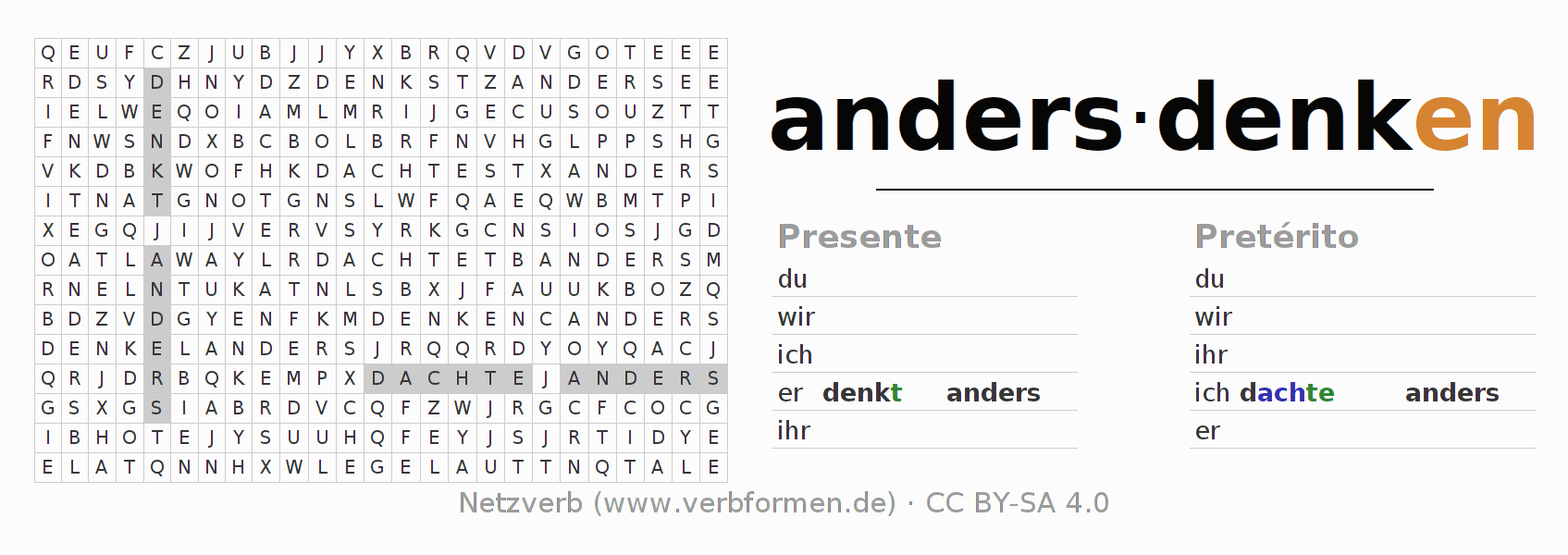 Las hojas de trabajo te ayudan para practicar con la conjugación de los verbos andersdenken en la escuela o de forma autodidacta. El material de estudio es Open Educational Resources (OER), es decir, libre de licencias CC BY-SA 4.0 y pude ser descargado y utilizado de forma gratuita, por ejemplo para la escuela. Con este fin tenemos para ti varios tipos de hojas de trabajo para los verbos andersdenken en forma de tablas de conjugación, acertijos y juegos. Todo el material esta disponible de forma gratuita para descargas PDF, imágenes y paginas web interactivas. Junto con los ejercicios hay innumerables ejemplos andersdenken que te ayudan en el uso de los verbos.