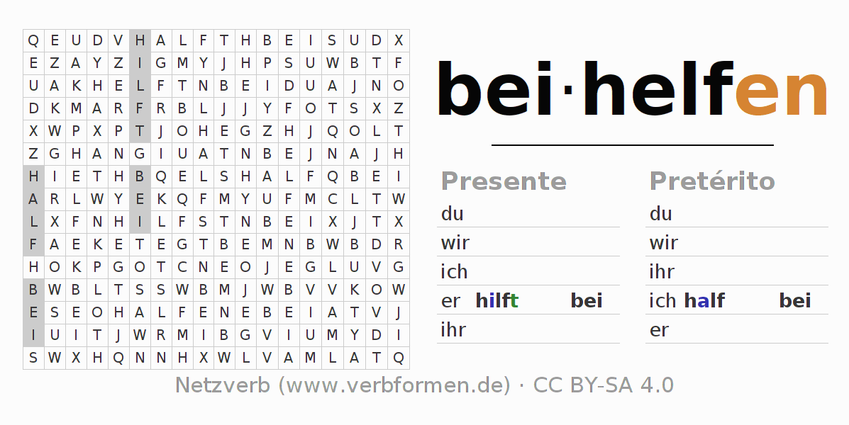 Las hojas de trabajo te ayudan para practicar con la conjugación de los verbos beihelfen en la escuela o de forma autodidacta. El material de estudio es Open Educational Resources (OER), es decir, libre de licencias CC BY-SA 4.0 y pude ser descargado y utilizado de forma gratuita, por ejemplo para la escuela. Con este fin tenemos para ti varios tipos de hojas de trabajo para los verbos beihelfen en forma de tablas de conjugación, acertijos y juegos. Todo el material esta disponible de forma gratuita para descargas PDF, imágenes y paginas web interactivas. Junto con los ejercicios hay innumerables ejemplos beihelfen que te ayudan en el uso de los verbos.