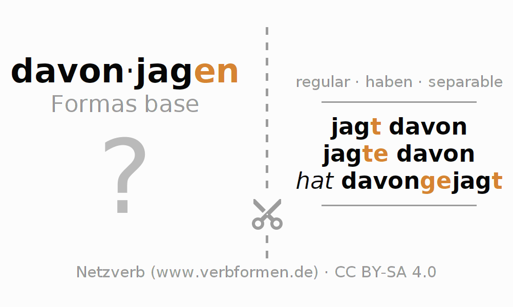Las hojas de trabajo te ayudan para practicar con la conjugación de los verbos davonjagen en la escuela o de forma autodidacta. El material de estudio es Open Educational Resources (OER), es decir, libre de licencias CC BY-SA 4.0 y pude ser descargado y utilizado de forma gratuita, por ejemplo para la escuela. Con este fin tenemos para ti varios tipos de hojas de trabajo para los verbos davonjagen en forma de tablas de conjugación, acertijos y juegos. Todo el material esta disponible de forma gratuita para descargas PDF, imágenes y paginas web interactivas. Junto con los ejercicios hay innumerables ejemplos davonjagen que te ayudan en el uso de los verbos.