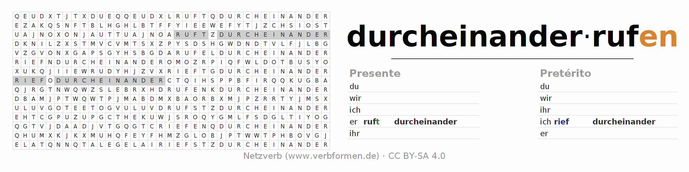 Las hojas de trabajo te ayudan para practicar con la conjugación de los verbos durcheinanderrufen en la escuela o de forma autodidacta. El material de estudio es Open Educational Resources (OER), es decir, libre de licencias CC BY-SA 4.0 y pude ser descargado y utilizado de forma gratuita, por ejemplo para la escuela. Con este fin tenemos para ti varios tipos de hojas de trabajo para los verbos durcheinanderrufen en forma de tablas de conjugación, acertijos y juegos. Todo el material esta disponible de forma gratuita para descargas PDF, imágenes y paginas web interactivas. Junto con los ejercicios hay innumerables ejemplos durcheinanderrufen que te ayudan en el uso de los verbos.