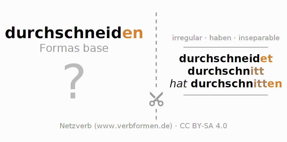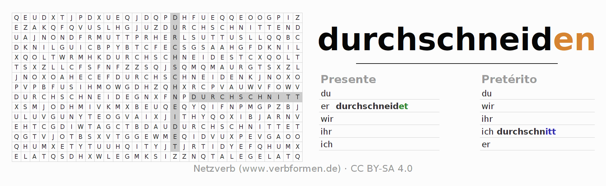 Las hojas de trabajo te ayudan para practicar con la conjugación de los verbos durchschneiden en la escuela o de forma autodidacta. El material de estudio es Open Educational Resources (OER), es decir, libre de licencias CC BY-SA 4.0 y pude ser descargado y utilizado de forma gratuita, por ejemplo para la escuela. Con este fin tenemos para ti varios tipos de hojas de trabajo para los verbos durchschneiden en forma de tablas de conjugación, acertijos y juegos. Todo el material esta disponible de forma gratuita para descargas PDF, imágenes y paginas web interactivas. Junto con los ejercicios hay innumerables ejemplos durchschneiden que te ayudan en el uso de los verbos.
