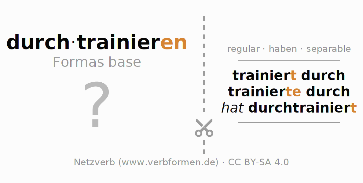 Las hojas de trabajo te ayudan para practicar con la conjugación de los verbos durchtrainieren en la escuela o de forma autodidacta. El material de estudio es Open Educational Resources (OER), es decir, libre de licencias CC BY-SA 4.0 y pude ser descargado y utilizado de forma gratuita, por ejemplo para la escuela. Con este fin tenemos para ti varios tipos de hojas de trabajo para los verbos durchtrainieren en forma de tablas de conjugación, acertijos y juegos. Todo el material esta disponible de forma gratuita para descargas PDF, imágenes y paginas web interactivas. Junto con los ejercicios hay innumerables ejemplos durchtrainieren que te ayudan en el uso de los verbos.