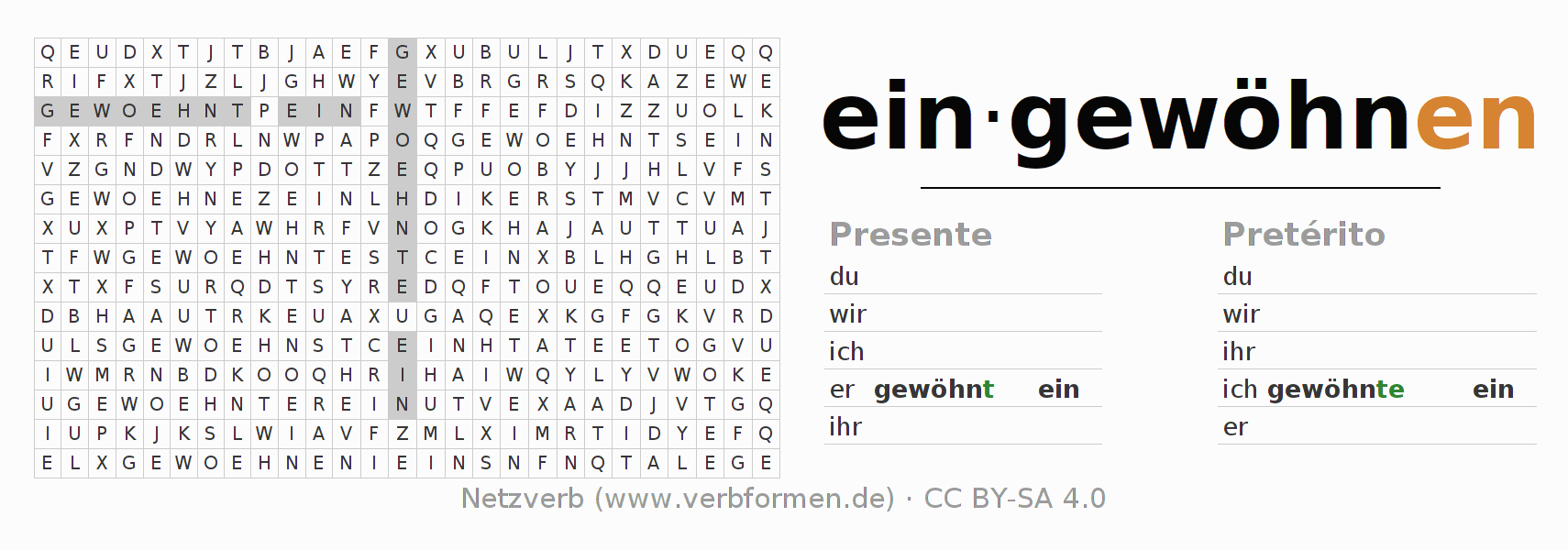 Las hojas de trabajo te ayudan para practicar con la conjugación de los verbos eingewöhnen en la escuela o de forma autodidacta. El material de estudio es Open Educational Resources (OER), es decir, libre de licencias CC BY-SA 4.0 y pude ser descargado y utilizado de forma gratuita, por ejemplo para la escuela. Con este fin tenemos para ti varios tipos de hojas de trabajo para los verbos eingewöhnen en forma de tablas de conjugación, acertijos y juegos. Todo el material esta disponible de forma gratuita para descargas PDF, imágenes y paginas web interactivas. Junto con los ejercicios hay innumerables ejemplos eingewöhnen que te ayudan en el uso de los verbos.