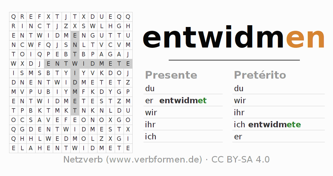 Las hojas de trabajo te ayudan para practicar con la conjugación de los verbos entwidmen en la escuela o de forma autodidacta. El material de estudio es Open Educational Resources (OER), es decir, libre de licencias CC BY-SA 4.0 y pude ser descargado y utilizado de forma gratuita, por ejemplo para la escuela. Con este fin tenemos para ti varios tipos de hojas de trabajo para los verbos entwidmen en forma de tablas de conjugación, acertijos y juegos. Todo el material esta disponible de forma gratuita para descargas PDF, imágenes y paginas web interactivas. Junto con los ejercicios hay innumerables ejemplos entwidmen que te ayudan en el uso de los verbos.