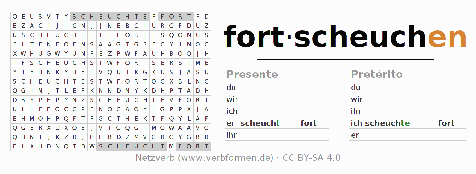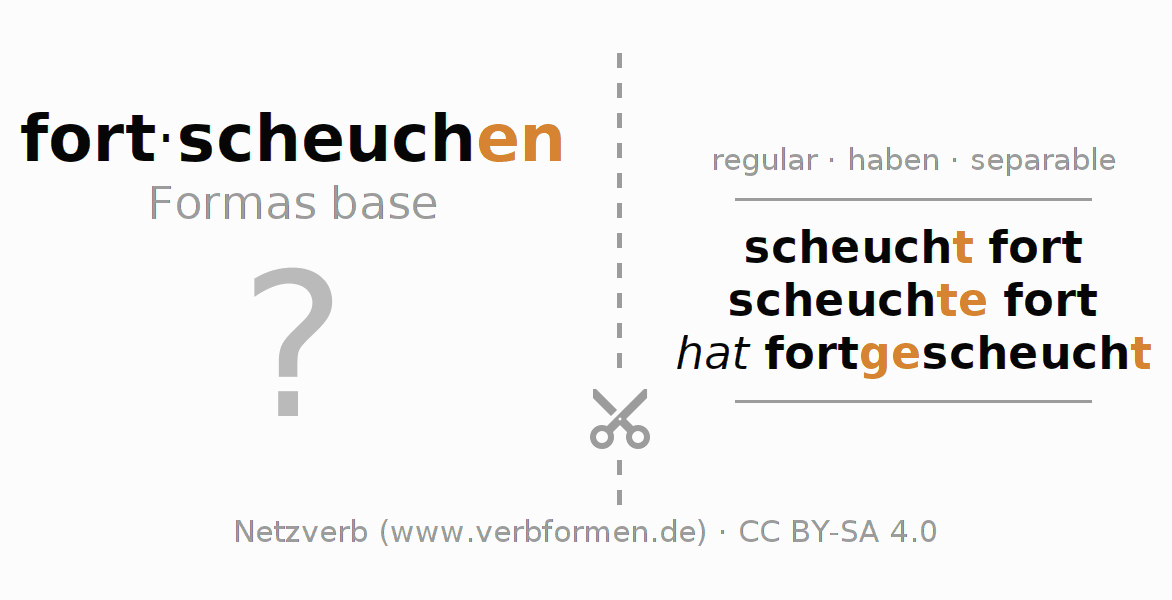 Las hojas de trabajo te ayudan para practicar con la conjugación de los verbos fortscheuchen en la escuela o de forma autodidacta. El material de estudio es Open Educational Resources (OER), es decir, libre de licencias CC BY-SA 4.0 y pude ser descargado y utilizado de forma gratuita, por ejemplo para la escuela. Con este fin tenemos para ti varios tipos de hojas de trabajo para los verbos fortscheuchen en forma de tablas de conjugación, acertijos y juegos. Todo el material esta disponible de forma gratuita para descargas PDF, imágenes y paginas web interactivas. Junto con los ejercicios hay innumerables ejemplos fortscheuchen que te ayudan en el uso de los verbos.