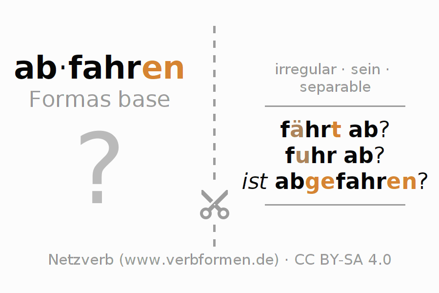 Las hojas de trabajo te ayudan para practicar con la conjugación de los verbos abfahren en la escuela o de forma autodidacta. El material de estudio es Open Educational Resources (OER), es decir, libre de licencias CC BY-SA 4.0 y pude ser descargado y utilizado de forma gratuita, por ejemplo para la escuela. Con este fin tenemos para ti varios tipos de hojas de trabajo para los verbos abfahren (ist) en forma de tablas de conjugación, acertijos y juegos. Todo el material esta disponible de forma gratuita para descargas PDF, imágenes y paginas web interactivas. Junto con los ejercicios hay innumerables ejemplos abfahren que te ayudan en el uso de los verbos.