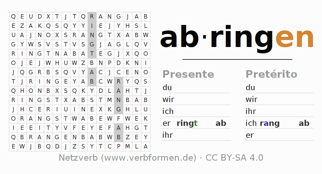 Las hojas de trabajo te ayudan para practicar con la conjugación de los verbos abringen en la escuela o de forma autodidacta. El material de estudio es Open Educational Resources (OER), es decir, libre de licencias CC BY-SA 4.0 y pude ser descargado y utilizado de forma gratuita, por ejemplo para la escuela. Con este fin tenemos para ti varios tipos de hojas de trabajo para los verbos abringen en forma de tablas de conjugación, acertijos y juegos. Todo el material esta disponible de forma gratuita para descargas PDF, imágenes y paginas web interactivas. Junto con los ejercicios hay innumerables ejemplos abringen que te ayudan en el uso de los verbos.