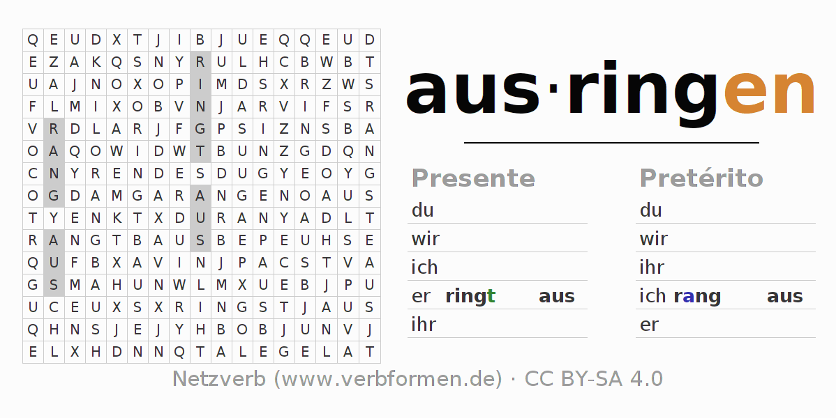 Las hojas de trabajo te ayudan para practicar con la conjugación de los verbos ausringen en la escuela o de forma autodidacta. El material de estudio es Open Educational Resources (OER), es decir, libre de licencias CC BY-SA 4.0 y pude ser descargado y utilizado de forma gratuita, por ejemplo para la escuela. Con este fin tenemos para ti varios tipos de hojas de trabajo para los verbos ausringen en forma de tablas de conjugación, acertijos y juegos. Todo el material esta disponible de forma gratuita para descargas PDF, imágenes y paginas web interactivas. Junto con los ejercicios hay innumerables ejemplos ausringen que te ayudan en el uso de los verbos.