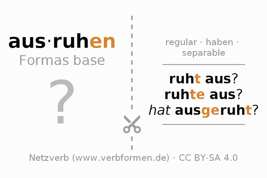Las hojas de trabajo te ayudan para practicar con la conjugación de los verbos ausruhen en la escuela o de forma autodidacta. El material de estudio es Open Educational Resources (OER), es decir, libre de licencias CC BY-SA 4.0 y pude ser descargado y utilizado de forma gratuita, por ejemplo para la escuela. Con este fin tenemos para ti varios tipos de hojas de trabajo para los verbos ausruhen en forma de tablas de conjugación, acertijos y juegos. Todo el material esta disponible de forma gratuita para descargas PDF, imágenes y paginas web interactivas. Junto con los ejercicios hay innumerables ejemplos ausruhen que te ayudan en el uso de los verbos.