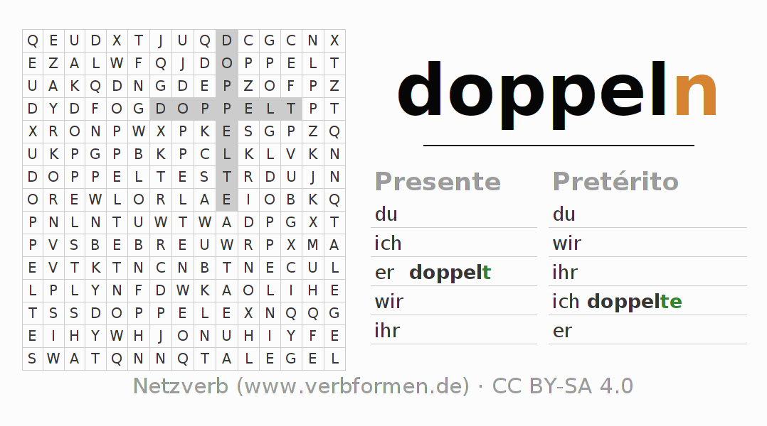Las hojas de trabajo te ayudan para practicar con la conjugación de los verbos doppeln en la escuela o de forma autodidacta. El material de estudio es Open Educational Resources (OER), es decir, libre de licencias CC BY-SA 4.0 y pude ser descargado y utilizado de forma gratuita, por ejemplo para la escuela. Con este fin tenemos para ti varios tipos de hojas de trabajo para los verbos doppeln en forma de tablas de conjugación, acertijos y juegos. Todo el material esta disponible de forma gratuita para descargas PDF, imágenes y paginas web interactivas. Junto con los ejercicios hay innumerables ejemplos doppeln que te ayudan en el uso de los verbos.