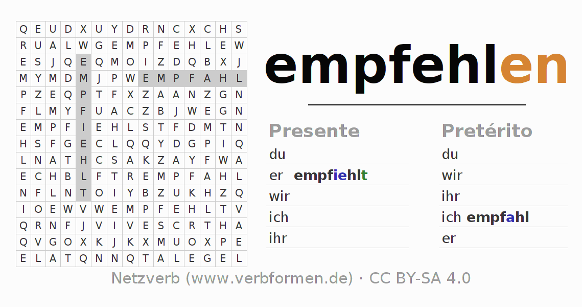 Las hojas de trabajo te ayudan para practicar con la conjugación de los verbos empfehlen en la escuela o de forma autodidacta. El material de estudio es Open Educational Resources (OER), es decir, libre de licencias CC BY-SA 4.0 y pude ser descargado y utilizado de forma gratuita, por ejemplo para la escuela. Con este fin tenemos para ti varios tipos de hojas de trabajo para los verbos empfehlen en forma de tablas de conjugación, acertijos y juegos. Todo el material esta disponible de forma gratuita para descargas PDF, imágenes y paginas web interactivas. Junto con los ejercicios hay innumerables ejemplos empfehlen que te ayudan en el uso de los verbos.