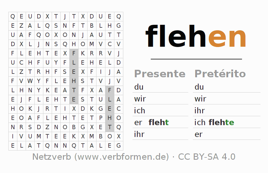 Las hojas de trabajo te ayudan para practicar con la conjugación de los verbos flehen en la escuela o de forma autodidacta. El material de estudio es Open Educational Resources (OER), es decir, libre de licencias CC BY-SA 4.0 y pude ser descargado y utilizado de forma gratuita, por ejemplo para la escuela. Con este fin tenemos para ti varios tipos de hojas de trabajo para los verbos flehen en forma de tablas de conjugación, acertijos y juegos. Todo el material esta disponible de forma gratuita para descargas PDF, imágenes y paginas web interactivas. Junto con los ejercicios hay innumerables ejemplos flehen que te ayudan en el uso de los verbos.