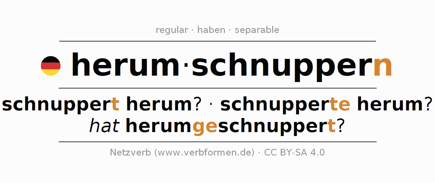 Tarjetas de aprendizaje, hojas de aprendizaje para todas las conjugaciones del verbo herumschnuppern