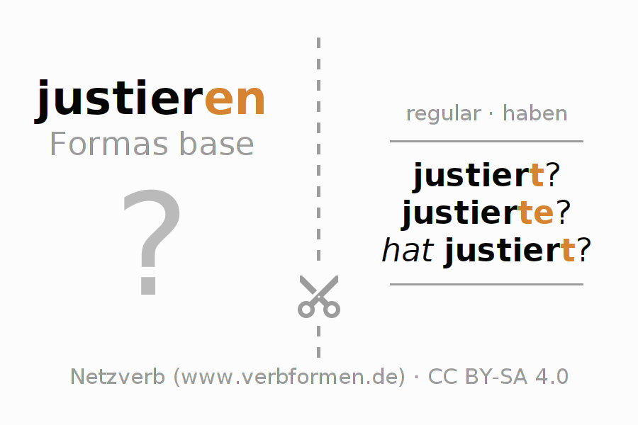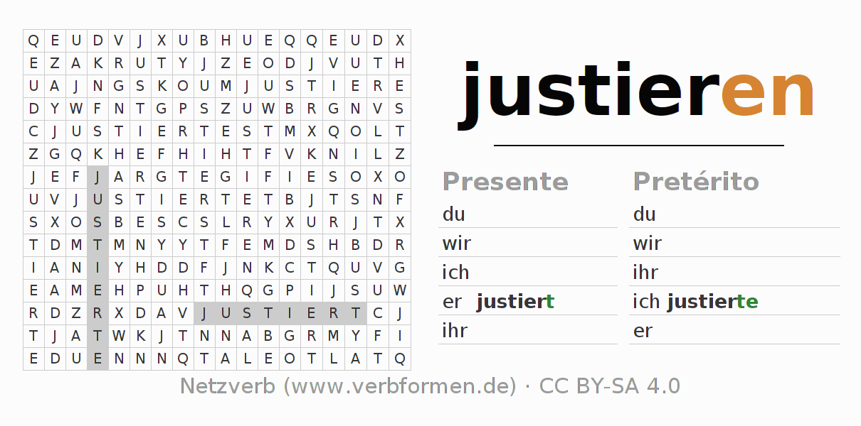 Las hojas de trabajo te ayudan para practicar con la conjugación de los verbos justieren en la escuela o de forma autodidacta. El material de estudio es Open Educational Resources (OER), es decir, libre de licencias CC BY-SA 4.0 y pude ser descargado y utilizado de forma gratuita, por ejemplo para la escuela. Con este fin tenemos para ti varios tipos de hojas de trabajo para los verbos justieren en forma de tablas de conjugación, acertijos y juegos. Todo el material esta disponible de forma gratuita para descargas PDF, imágenes y paginas web interactivas. Junto con los ejercicios hay innumerables ejemplos justieren que te ayudan en el uso de los verbos.