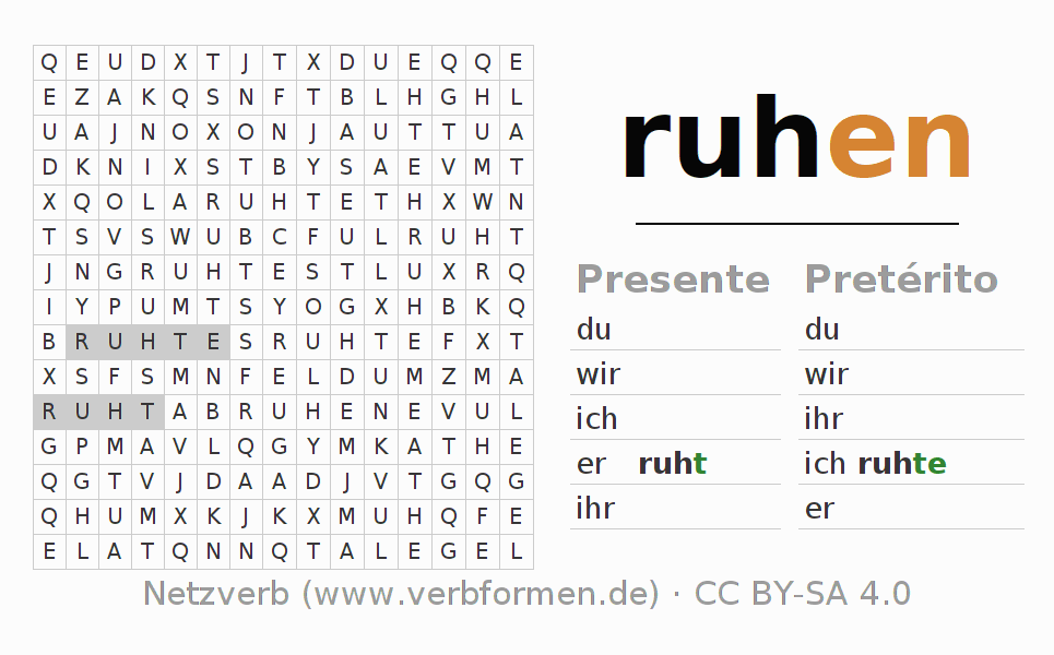 Las hojas de trabajo te ayudan para practicar con la conjugación de los verbos ruhen en la escuela o de forma autodidacta. El material de estudio es Open Educational Resources (OER), es decir, libre de licencias CC BY-SA 4.0 y pude ser descargado y utilizado de forma gratuita, por ejemplo para la escuela. Con este fin tenemos para ti varios tipos de hojas de trabajo para los verbos ruhen en forma de tablas de conjugación, acertijos y juegos. Todo el material esta disponible de forma gratuita para descargas PDF, imágenes y paginas web interactivas. Junto con los ejercicios hay innumerables ejemplos ruhen que te ayudan en el uso de los verbos.