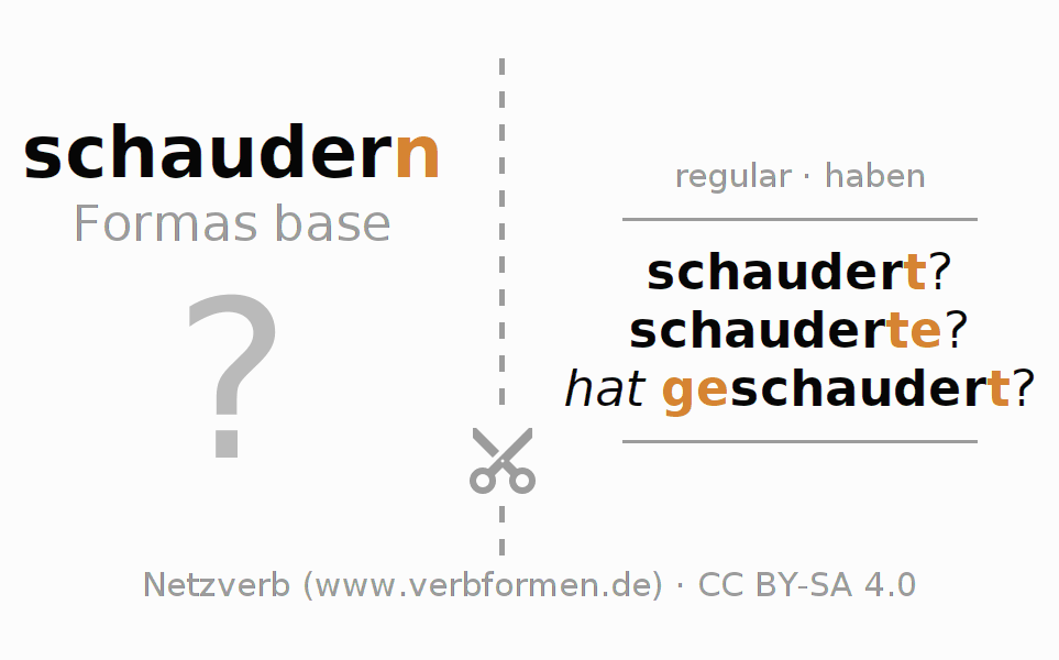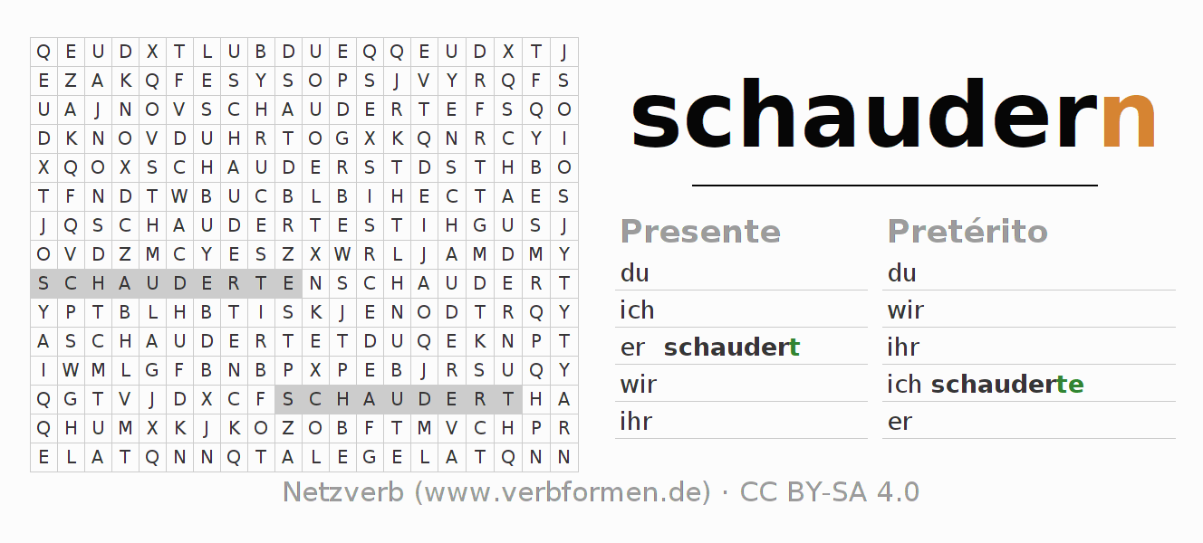 Las hojas de trabajo te ayudan para practicar con la conjugación de los verbos schaudern en la escuela o de forma autodidacta. El material de estudio es Open Educational Resources (OER), es decir, libre de licencias CC BY-SA 4.0 y pude ser descargado y utilizado de forma gratuita, por ejemplo para la escuela. Con este fin tenemos para ti varios tipos de hojas de trabajo para los verbos schaudern en forma de tablas de conjugación, acertijos y juegos. Todo el material esta disponible de forma gratuita para descargas PDF, imágenes y paginas web interactivas. Junto con los ejercicios hay innumerables ejemplos schaudern que te ayudan en el uso de los verbos.