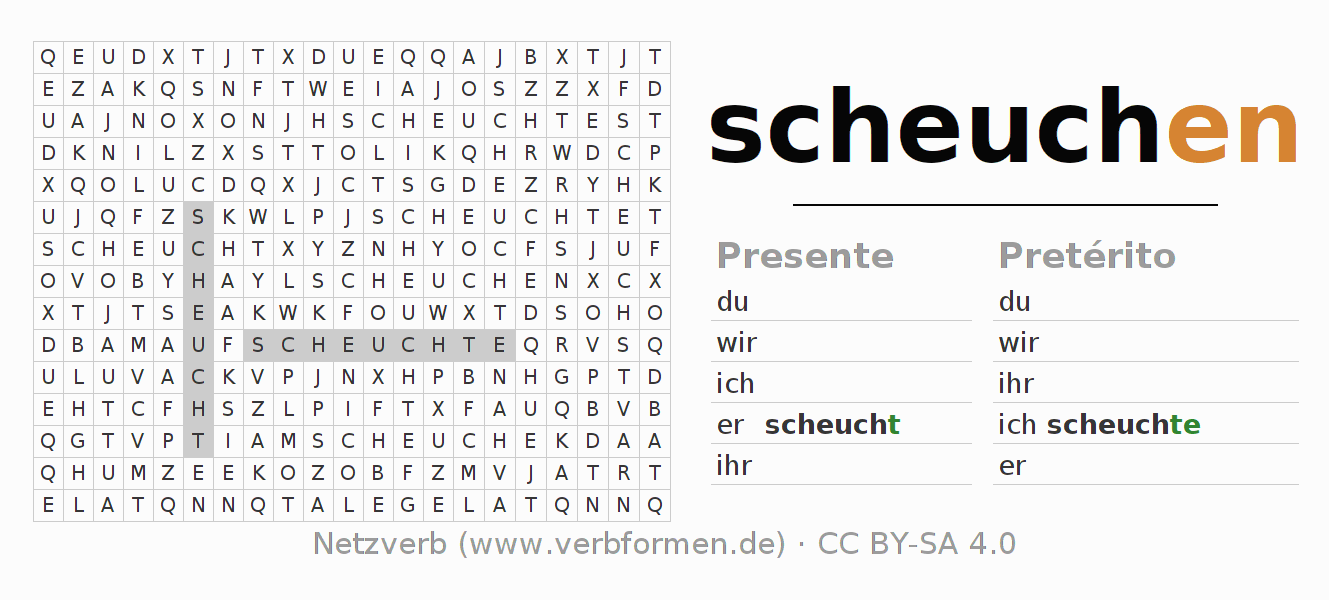 Las hojas de trabajo te ayudan para practicar con la conjugación de los verbos scheuchen en la escuela o de forma autodidacta. El material de estudio es Open Educational Resources (OER), es decir, libre de licencias CC BY-SA 4.0 y pude ser descargado y utilizado de forma gratuita, por ejemplo para la escuela. Con este fin tenemos para ti varios tipos de hojas de trabajo para los verbos scheuchen en forma de tablas de conjugación, acertijos y juegos. Todo el material esta disponible de forma gratuita para descargas PDF, imágenes y paginas web interactivas. Junto con los ejercicios hay innumerables ejemplos scheuchen que te ayudan en el uso de los verbos.