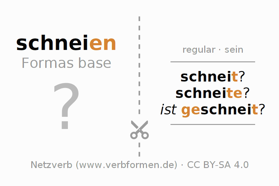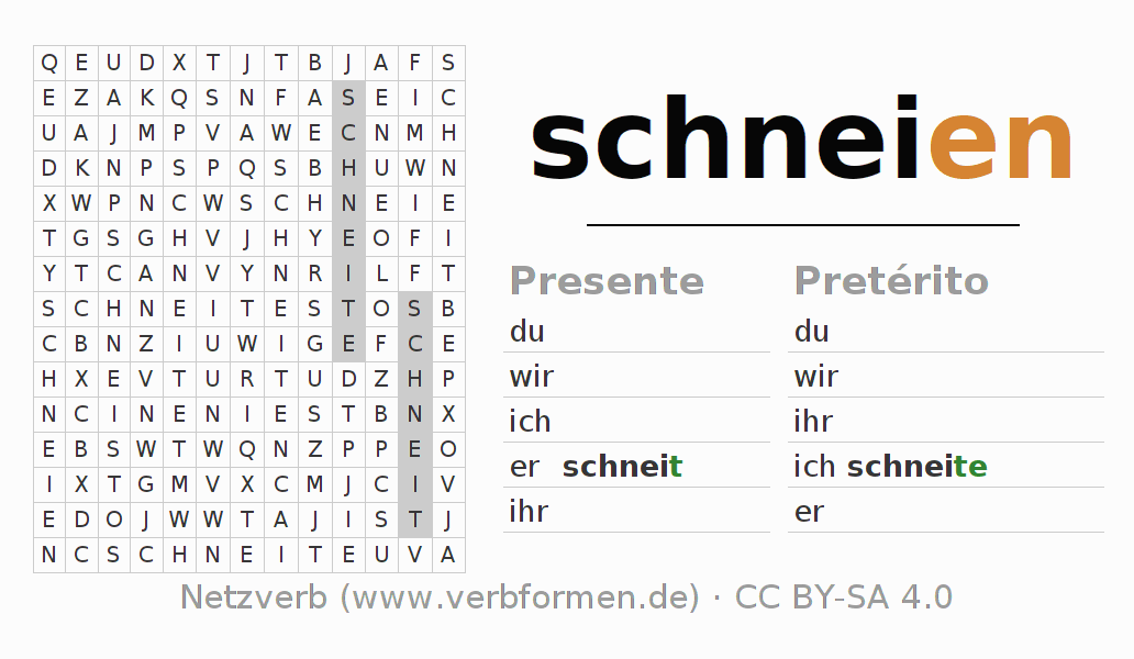 Las hojas de trabajo te ayudan para practicar con la conjugación de los verbos schneien en la escuela o de forma autodidacta. El material de estudio es Open Educational Resources (OER), es decir, libre de licencias CC BY-SA 4.0 y pude ser descargado y utilizado de forma gratuita, por ejemplo para la escuela. Con este fin tenemos para ti varios tipos de hojas de trabajo para los verbos schneien (ist) en forma de tablas de conjugación, acertijos y juegos. Todo el material esta disponible de forma gratuita para descargas PDF, imágenes y paginas web interactivas. Junto con los ejercicios hay innumerables ejemplos schneien que te ayudan en el uso de los verbos.