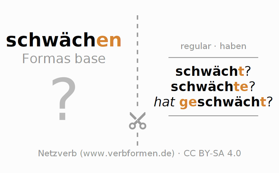 Las hojas de trabajo te ayudan para practicar con la conjugación de los verbos schwächen en la escuela o de forma autodidacta. El material de estudio es Open Educational Resources (OER), es decir, libre de licencias CC BY-SA 4.0 y pude ser descargado y utilizado de forma gratuita, por ejemplo para la escuela. Con este fin tenemos para ti varios tipos de hojas de trabajo para los verbos schwächen en forma de tablas de conjugación, acertijos y juegos. Todo el material esta disponible de forma gratuita para descargas PDF, imágenes y paginas web interactivas. Junto con los ejercicios hay innumerables ejemplos schwächen que te ayudan en el uso de los verbos.