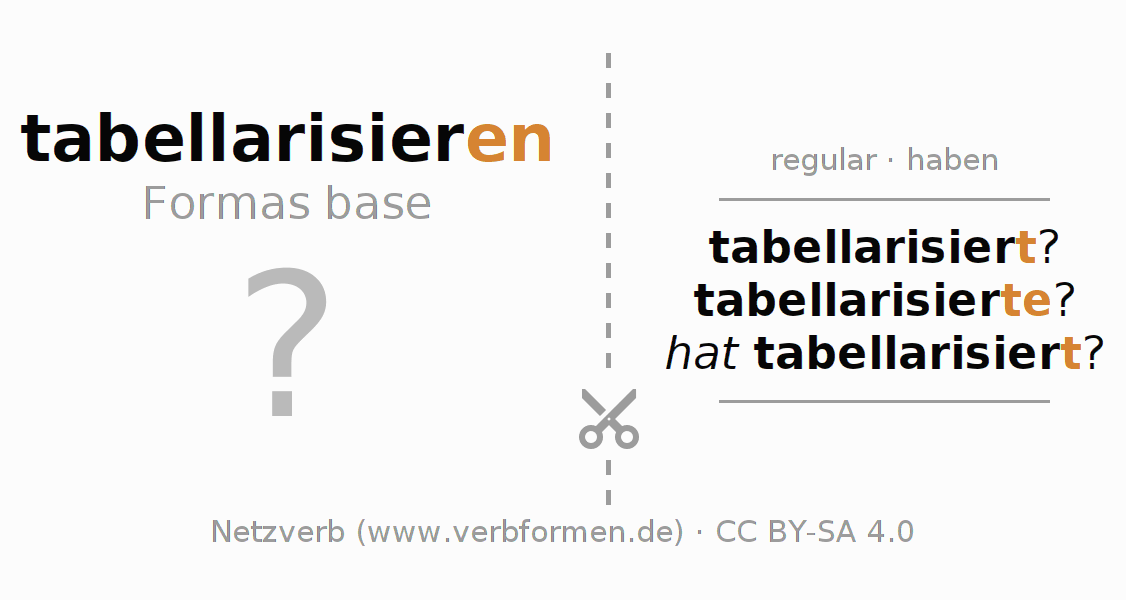 Las hojas de trabajo te ayudan para practicar con la conjugación de los verbos tabellarisieren en la escuela o de forma autodidacta. El material de estudio es Open Educational Resources (OER), es decir, libre de licencias CC BY-SA 4.0 y pude ser descargado y utilizado de forma gratuita, por ejemplo para la escuela. Con este fin tenemos para ti varios tipos de hojas de trabajo para los verbos tabellarisieren en forma de tablas de conjugación, acertijos y juegos. Todo el material esta disponible de forma gratuita para descargas PDF, imágenes y paginas web interactivas. Junto con los ejercicios hay innumerables ejemplos tabellarisieren que te ayudan en el uso de los verbos.