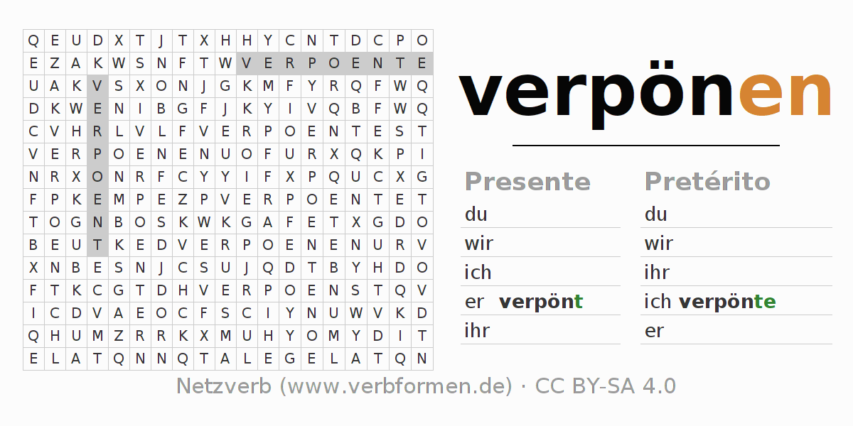 Las hojas de trabajo te ayudan para practicar con la conjugación de los verbos verpönen en la escuela o de forma autodidacta. El material de estudio es Open Educational Resources (OER), es decir, libre de licencias CC BY-SA 4.0 y pude ser descargado y utilizado de forma gratuita, por ejemplo para la escuela. Con este fin tenemos para ti varios tipos de hojas de trabajo para los verbos verpönen en forma de tablas de conjugación, acertijos y juegos. Todo el material esta disponible de forma gratuita para descargas PDF, imágenes y paginas web interactivas. Junto con los ejercicios hay innumerables ejemplos verpönen que te ayudan en el uso de los verbos.