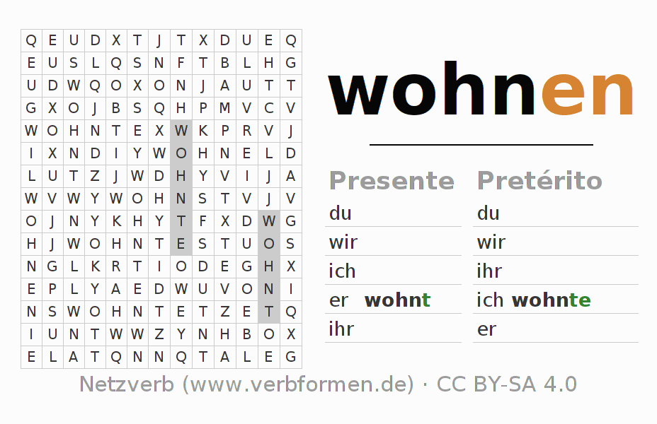 Las hojas de trabajo te ayudan para practicar con la conjugación de los verbos wohnen en la escuela o de forma autodidacta. El material de estudio es Open Educational Resources (OER), es decir, libre de licencias CC BY-SA 4.0 y pude ser descargado y utilizado de forma gratuita, por ejemplo para la escuela. Con este fin tenemos para ti varios tipos de hojas de trabajo para los verbos wohnen en forma de tablas de conjugación, acertijos y juegos. Todo el material esta disponible de forma gratuita para descargas PDF, imágenes y paginas web interactivas. Junto con los ejercicios hay innumerables ejemplos wohnen que te ayudan en el uso de los verbos.