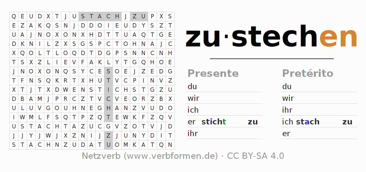 Las hojas de trabajo te ayudan para practicar con la conjugación de los verbos zustechen en la escuela o de forma autodidacta. El material de estudio es Open Educational Resources (OER), es decir, libre de licencias CC BY-SA 4.0 y pude ser descargado y utilizado de forma gratuita, por ejemplo para la escuela. Con este fin tenemos para ti varios tipos de hojas de trabajo para los verbos zustechen en forma de tablas de conjugación, acertijos y juegos. Todo el material esta disponible de forma gratuita para descargas PDF, imágenes y paginas web interactivas. Junto con los ejercicios hay innumerables ejemplos zustechen que te ayudan en el uso de los verbos.