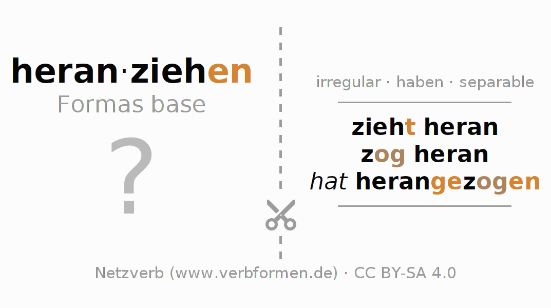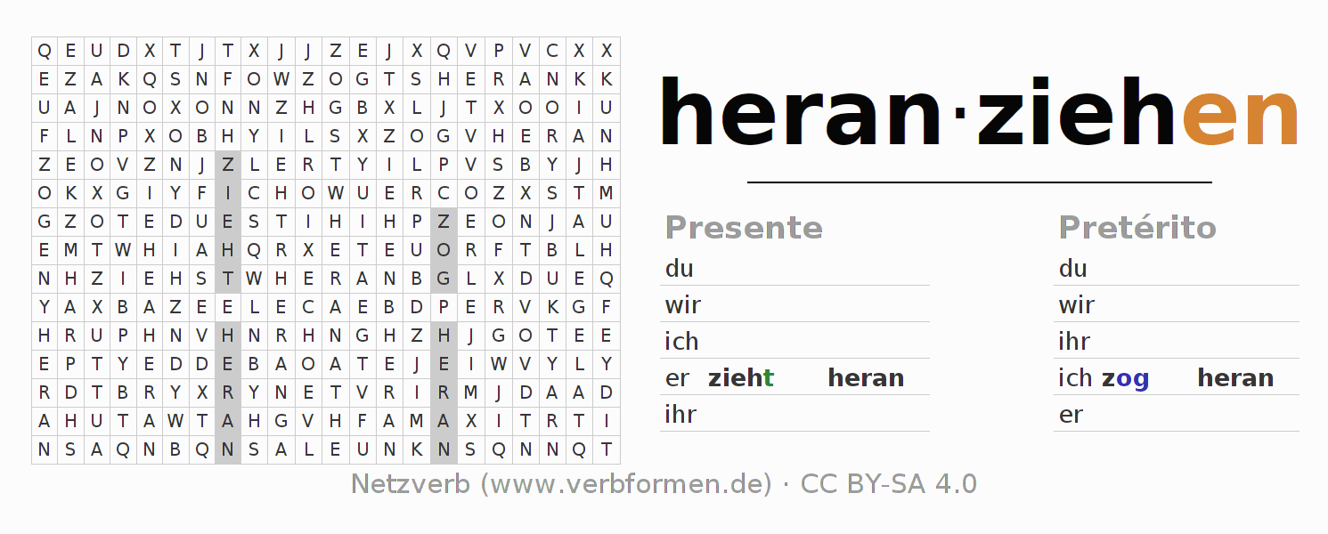 Las hojas de trabajo te ayudan para practicar con la conjugación de los verbos heranziehen en la escuela o de forma autodidacta. El material de estudio es Open Educational Resources (OER), es decir, libre de licencias CC BY-SA 4.0 y pude ser descargado y utilizado de forma gratuita, por ejemplo para la escuela. Con este fin tenemos para ti varios tipos de hojas de trabajo para los verbos heranziehen en forma de tablas de conjugación, acertijos y juegos. Todo el material esta disponible de forma gratuita para descargas PDF, imágenes y paginas web interactivas. Junto con los ejercicios hay innumerables ejemplos heranziehen que te ayudan en el uso de los verbos.