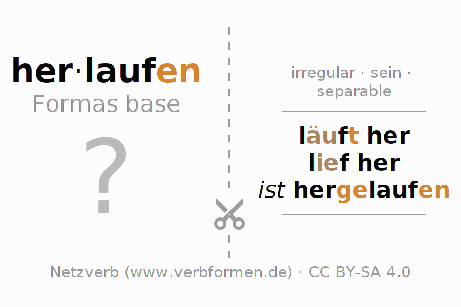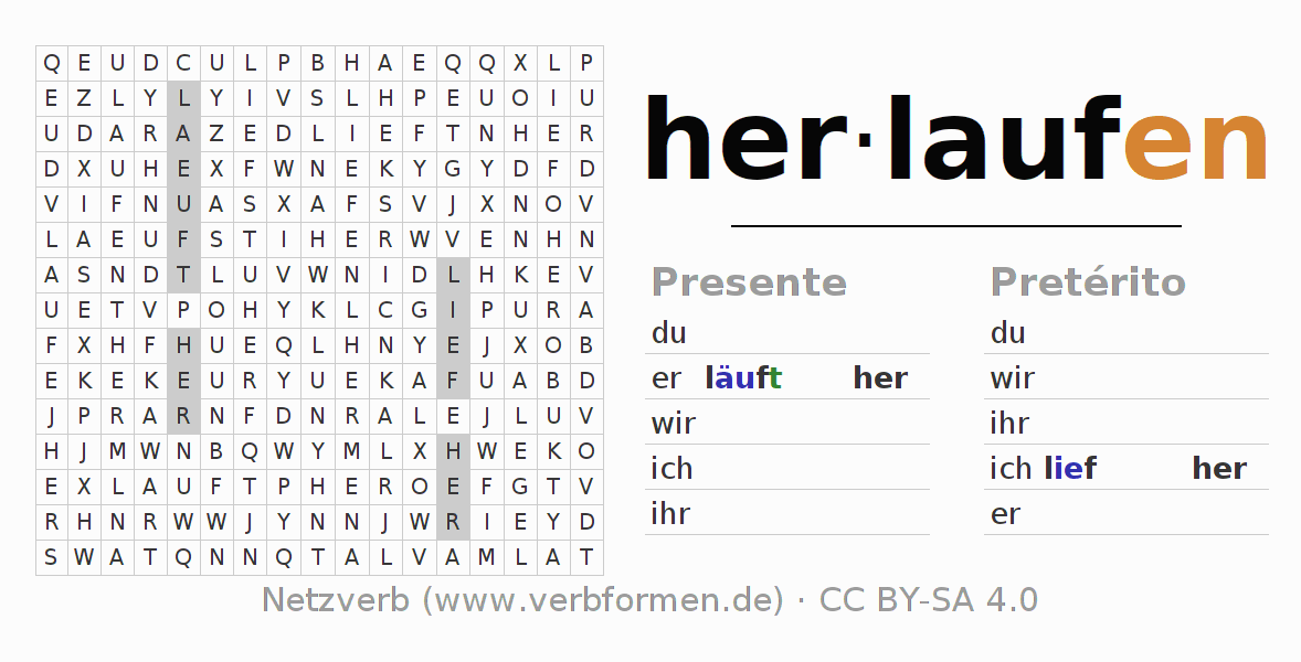 Las hojas de trabajo te ayudan para practicar con la conjugación de los verbos herlaufen en la escuela o de forma autodidacta. El material de estudio es Open Educational Resources (OER), es decir, libre de licencias CC BY-SA 4.0 y pude ser descargado y utilizado de forma gratuita, por ejemplo para la escuela. Con este fin tenemos para ti varios tipos de hojas de trabajo para los verbos herlaufen en forma de tablas de conjugación, acertijos y juegos. Todo el material esta disponible de forma gratuita para descargas PDF, imágenes y paginas web interactivas. Junto con los ejercicios hay innumerables ejemplos herlaufen que te ayudan en el uso de los verbos.