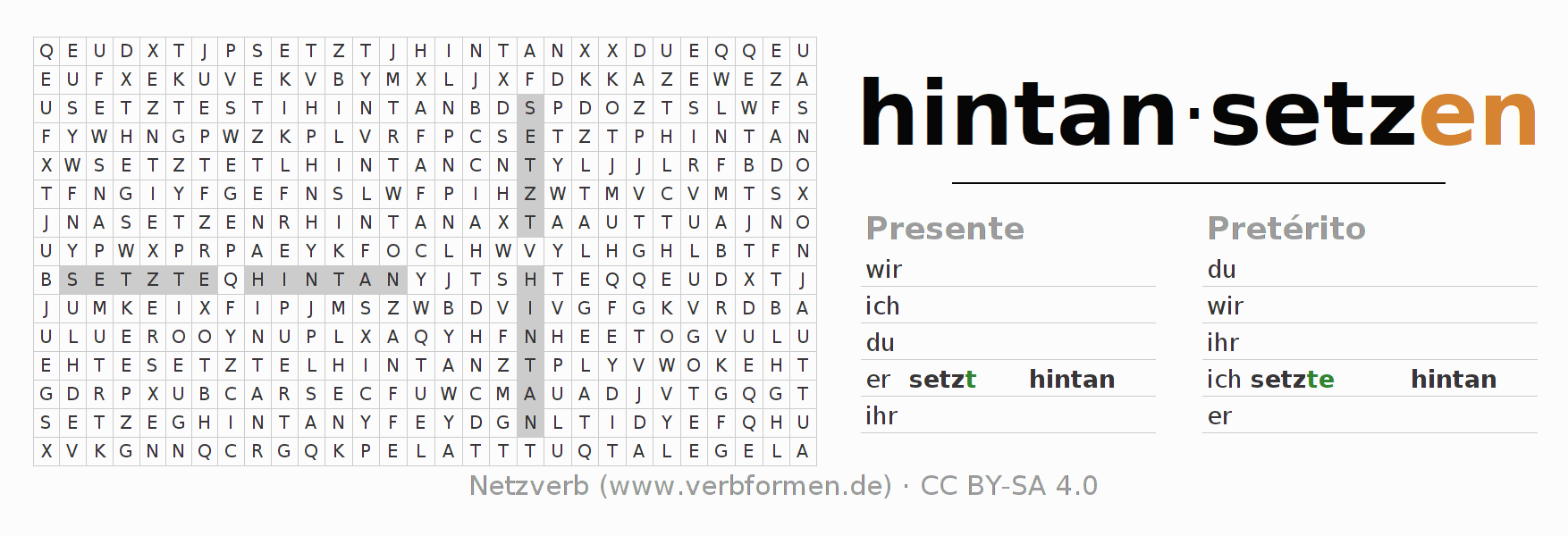Las hojas de trabajo te ayudan para practicar con la conjugación de los verbos hintansetzen en la escuela o de forma autodidacta. El material de estudio es Open Educational Resources (OER), es decir, libre de licencias CC BY-SA 4.0 y pude ser descargado y utilizado de forma gratuita, por ejemplo para la escuela. Con este fin tenemos para ti varios tipos de hojas de trabajo para los verbos hintansetzen en forma de tablas de conjugación, acertijos y juegos. Todo el material esta disponible de forma gratuita para descargas PDF, imágenes y paginas web interactivas. Junto con los ejercicios hay innumerables ejemplos hintansetzen que te ayudan en el uso de los verbos.