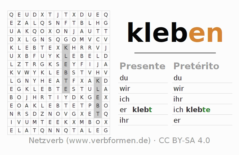 Las hojas de trabajo te ayudan para practicar con la conjugación de los verbos kleben en la escuela o de forma autodidacta. El material de estudio es Open Educational Resources (OER), es decir, libre de licencias CC BY-SA 4.0 y pude ser descargado y utilizado de forma gratuita, por ejemplo para la escuela. Con este fin tenemos para ti varios tipos de hojas de trabajo para los verbos kleben en forma de tablas de conjugación, acertijos y juegos. Todo el material esta disponible de forma gratuita para descargas PDF, imágenes y paginas web interactivas. Junto con los ejercicios hay innumerables ejemplos kleben que te ayudan en el uso de los verbos.