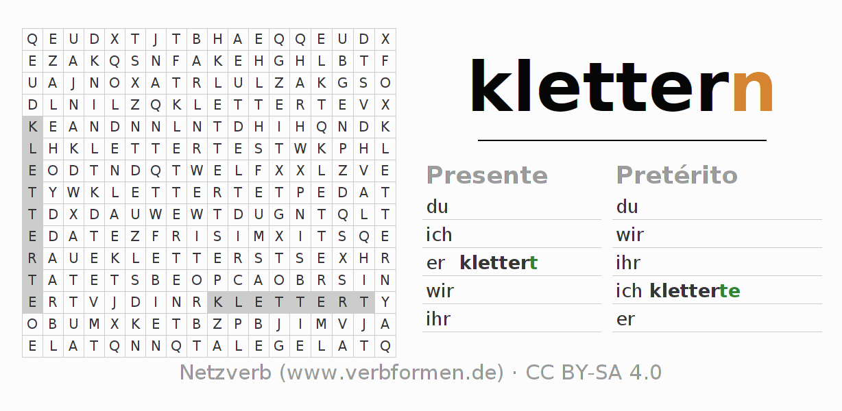 Las hojas de trabajo te ayudan para practicar con la conjugación de los verbos klettern en la escuela o de forma autodidacta. El material de estudio es Open Educational Resources (OER), es decir, libre de licencias CC BY-SA 4.0 y pude ser descargado y utilizado de forma gratuita, por ejemplo para la escuela. Con este fin tenemos para ti varios tipos de hojas de trabajo para los verbos klettern (hat) en forma de tablas de conjugación, acertijos y juegos. Todo el material esta disponible de forma gratuita para descargas PDF, imágenes y paginas web interactivas. Junto con los ejercicios hay innumerables ejemplos klettern que te ayudan en el uso de los verbos.