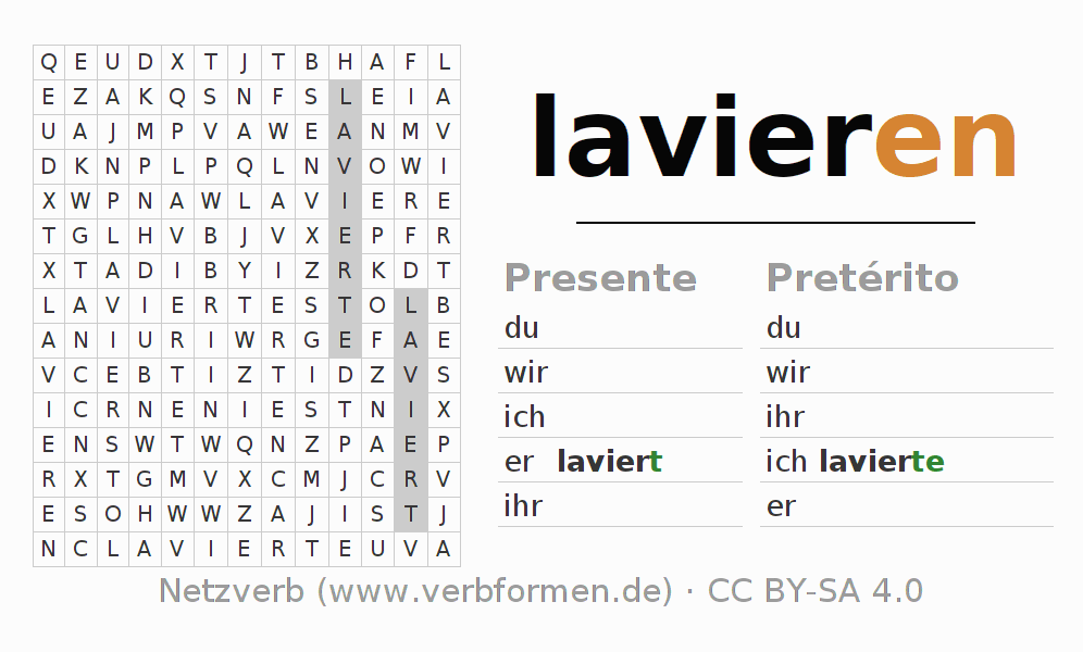 Las hojas de trabajo te ayudan para practicar con la conjugación de los verbos lavieren en la escuela o de forma autodidacta. El material de estudio es Open Educational Resources (OER), es decir, libre de licencias CC BY-SA 4.0 y pude ser descargado y utilizado de forma gratuita, por ejemplo para la escuela. Con este fin tenemos para ti varios tipos de hojas de trabajo para los verbos lavieren (ist) en forma de tablas de conjugación, acertijos y juegos. Todo el material esta disponible de forma gratuita para descargas PDF, imágenes y paginas web interactivas. Junto con los ejercicios hay innumerables ejemplos lavieren que te ayudan en el uso de los verbos.