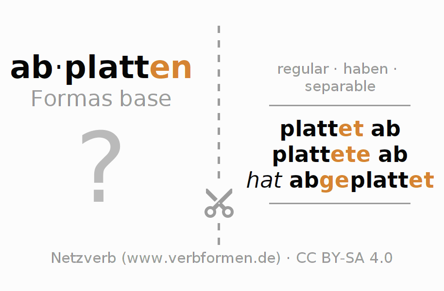 Guía: imprime y corta las cartas de aprendizaje para el verbo abplatten. Después mezcla y apila cartas con diferentes verbos. Así podrás ir sacando las cartas de una por una. Sin ojear tienes que evocar de tu memoria los datos en las cartas. Para comprobar tus respuestas utiliza la información que aparece en las hojas de aprendizaje.