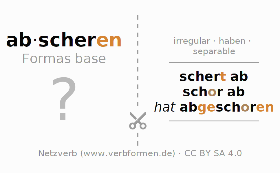 Con las cartas de aprendizaje puedes aprender y practicar cada forma verbal del alemán. Los ejercicios en las hojas de aprendizaje para el verbo abscheren están ordenados para que los puedas trabajar en serie. Las formas verbales requeridas se responden evocándolas de tu memoria y al final comparas tus respuestas con los datos en las fichas. Si has contestado correctamente se confirmará así tu aprendizaje, y en caso que las respuestas no concuerden, puedes utilizar los consejos mostrados para memorizar las formas que no conocías. De preferencia imprimes las cartas de aprendizaje y las doblas como está indicado. Así podrás estudiar varios verbos a la vez en forma de columna. También hay varios otros tipos de hojas de trabajo para los verbos. Todo el material de estudio es Open Educational Resources (OER), es decir, libre de licencias CC BY-SA 4.0 y puede ser descargado y utilizado de forma gratuita.