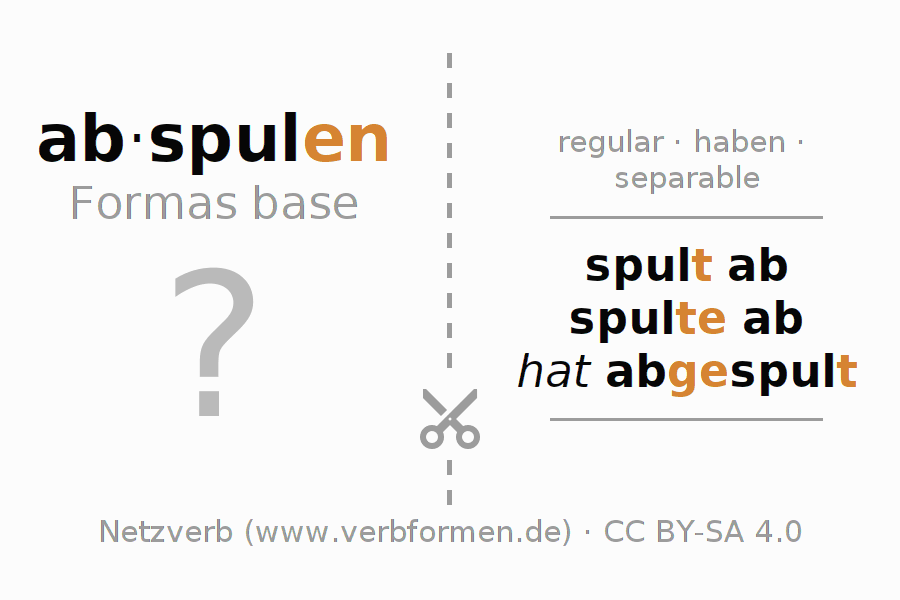 Con las cartas de aprendizaje puedes aprender y practicar cada forma verbal del alemán. Los ejercicios en las hojas de aprendizaje para el verbo abspulen están ordenados para que los puedas trabajar en serie. Las formas verbales requeridas se responden evocándolas de tu memoria y al final comparas tus respuestas con los datos en las fichas. Si has contestado correctamente se confirmará así tu aprendizaje, y en caso que las respuestas no concuerden, puedes utilizar los consejos mostrados para memorizar las formas que no conocías. De preferencia imprimes las cartas de aprendizaje y las doblas como está indicado. Así podrás estudiar varios verbos a la vez en forma de columna. También hay varios otros tipos de hojas de trabajo para los verbos. Todo el material de estudio es Open Educational Resources (OER), es decir, libre de licencias CC BY-SA 4.0 y puede ser descargado y utilizado de forma gratuita.